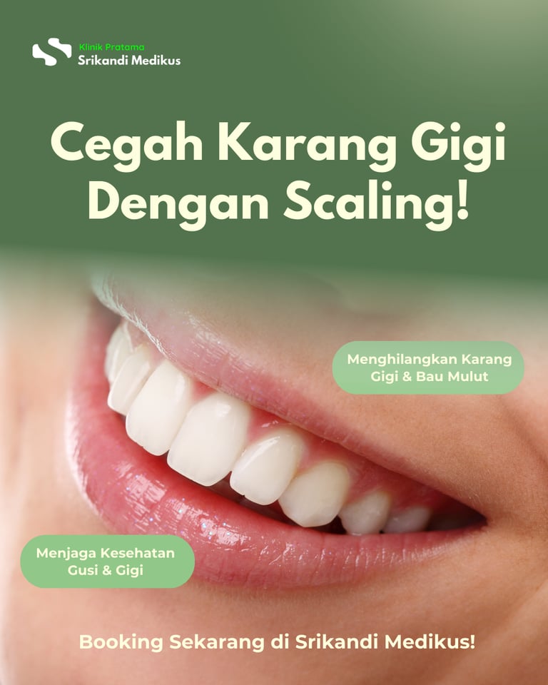 Lengkapi perawatan mandiri Anda dengan melakukan prosedur scaling gigi di Srikandi Medikus untuk menghilangkan karang gigi yang menjadi sarang bakteri penyebab bau mulut saat berpuasa. Dengan dukungan tim medis profesional dan peralatan modern, scaling di Srikandi Medikus akan memastikan rongga mulut Anda benar-benar bersih, sehat, dan bebas dari aroma tidak sedap, sehingga Anda bisa menjalankan ibadah Ramadan dengan lebih percaya diri dan nyaman.